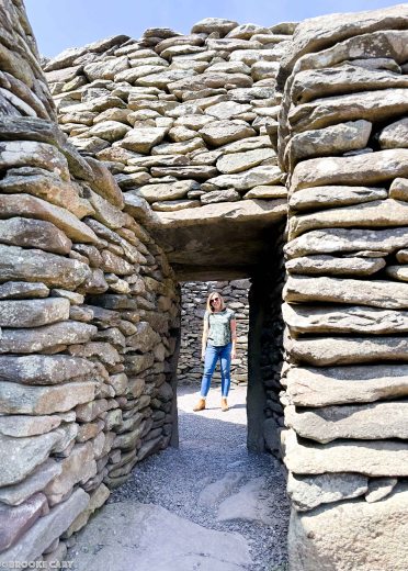 We followed the signs for Slea Head Drive, a 30-mile scenic loop. The road is mostly one lane (no surprise there) and twisty so they recommend driving it clockwise. After a few miles, we were intrigued by a turnoff for the Fahan Beehive Huts. These stone dwellings are perched high on the hill and while their exact age is uncertain, the sign said 2,000 BC. The meticulous stonework is impressive, and also that there is no mortar holding them together.